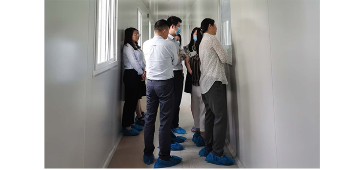 市场部唐薇带领信立泰一行人参观公司展厅及公司耗材生产洁净车间,并由生产部陈洁经理介绍耗材生产工艺